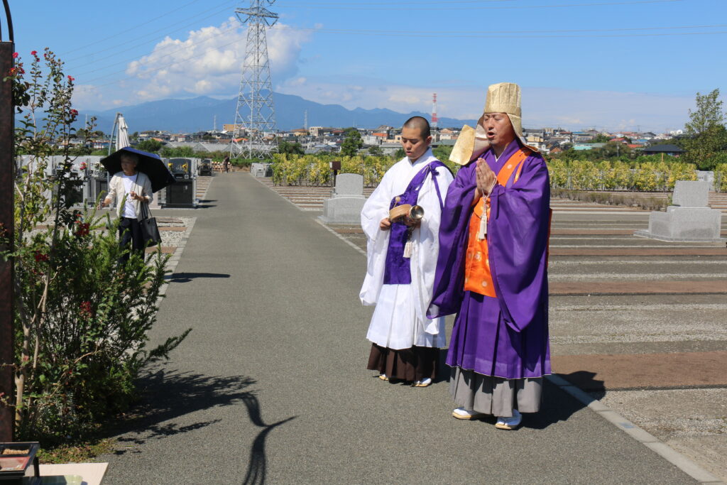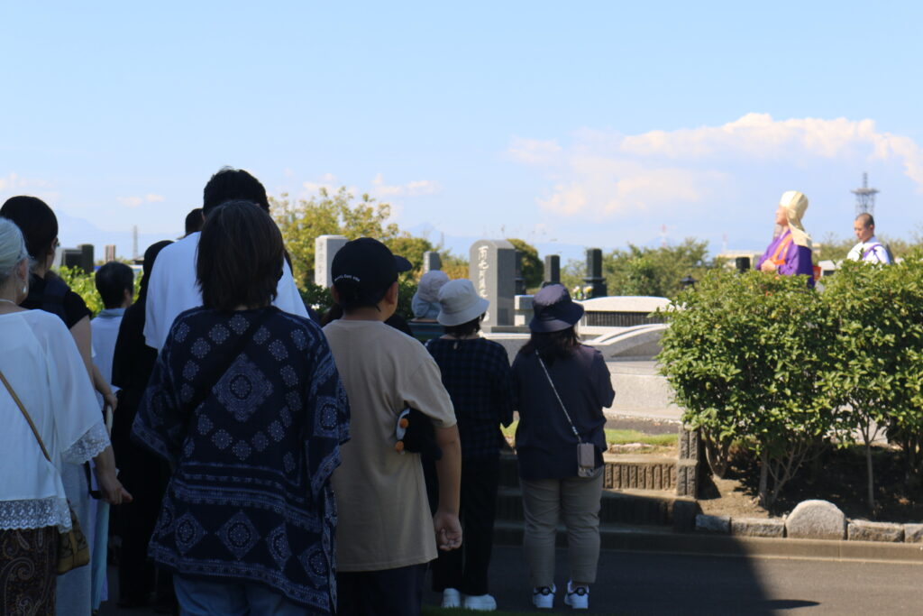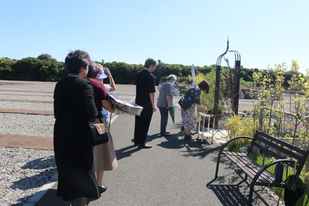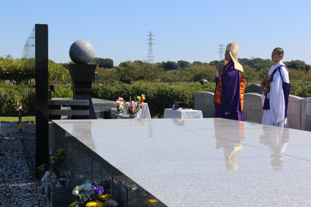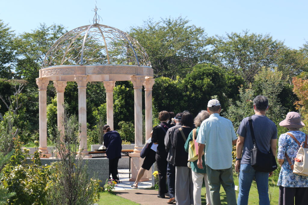 残暑が厳しい中での挙行となりましたが、それぞれのお墓にはたくさんの方がおみえいただきました。今年もお彼岸最終日にあたる9月26日㈮に湘南公園墓地・茅ヶ崎霊園内にある当法人が所有する全ての永代供養墓・樹木葬にて合同慰霊祭が執り行われました。「湘南やすらぎの碑」「セレストテラス」では、日蓮宗の示現寺お上人によりお経をあげていただき、「スプリングローズガーデン」では、献花式という形で故人の方への思いをそれぞれのお客様が心の中で唱えていたかと思います。それぞれ挙行の様子をご紹介いたします。