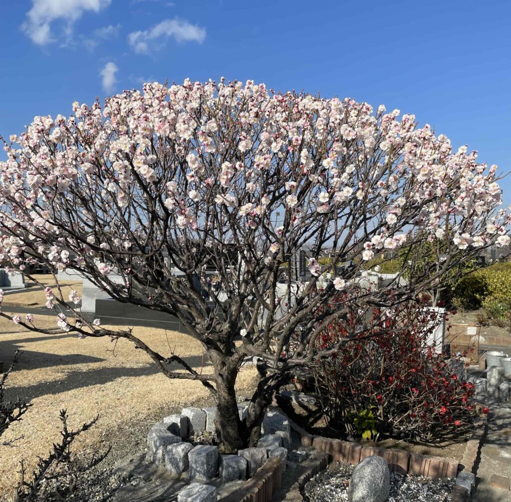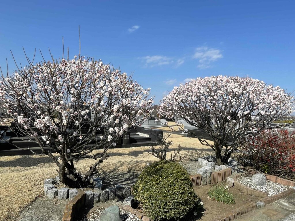 園内では梅の花が咲き始めています!白くてかわいい花が咲き、春の訪れを告げています。