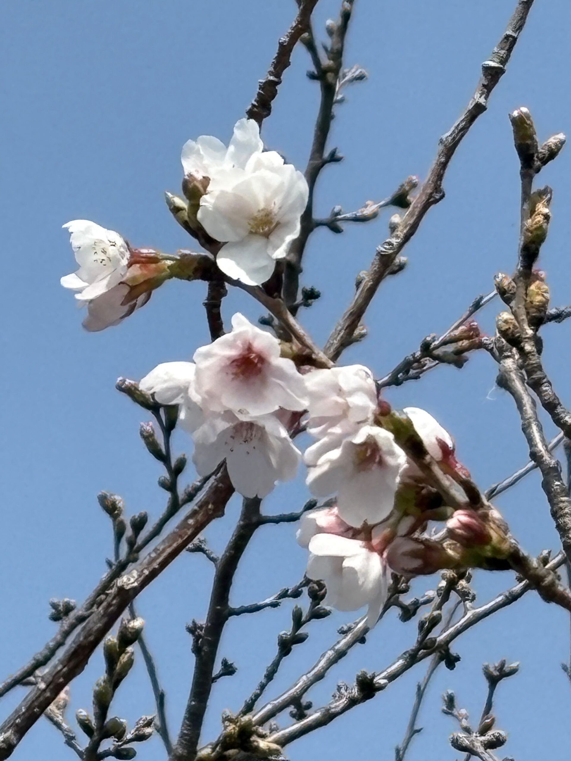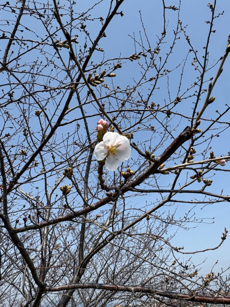 開花状況報告の為、園内巡回したところ、青空に向かって、凛と咲く桜を発見。